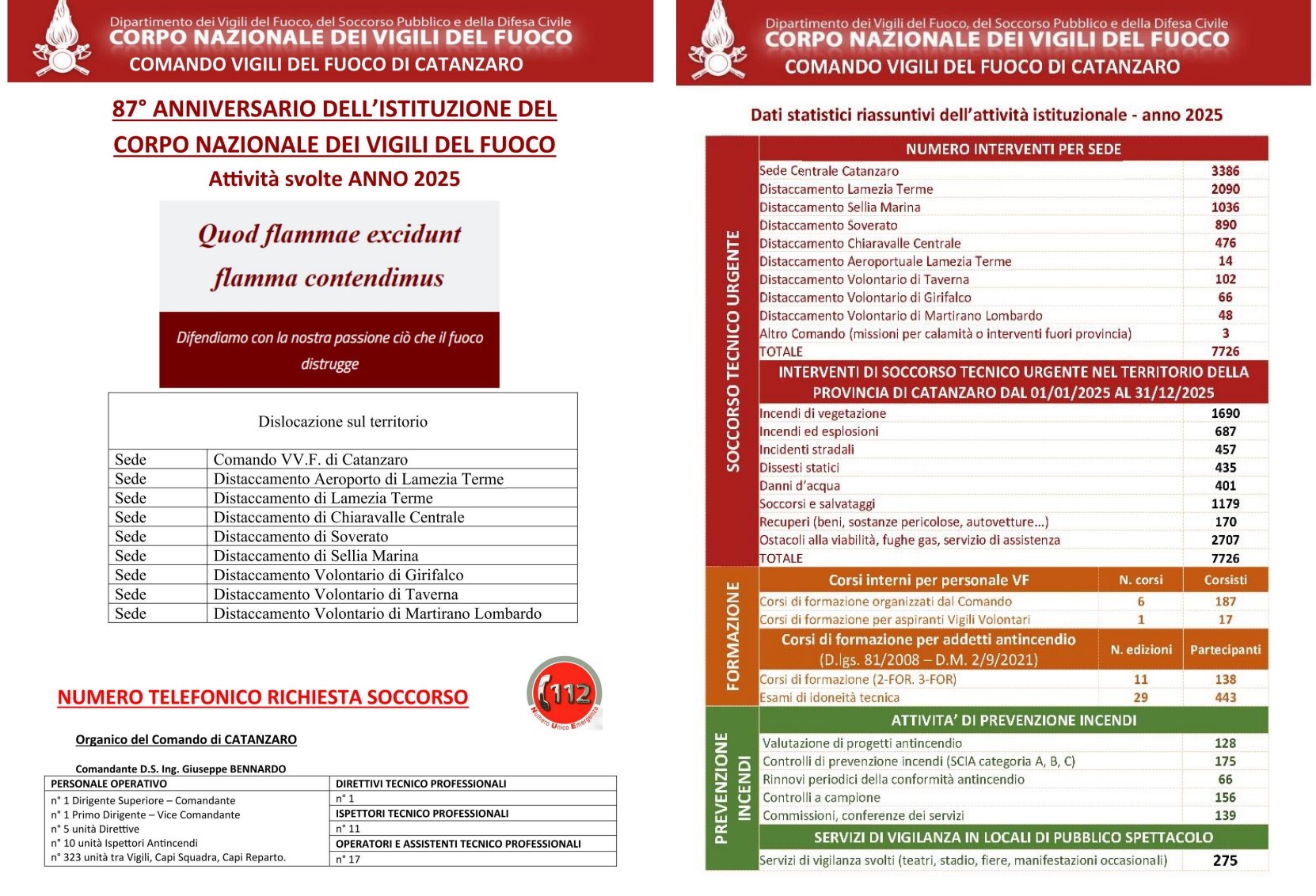 Successivamente, il Dirigente Vicario Giovanni Carella ha illustrato i dati statistici relativi all’attività svolta dal Comando Provinciale di Catanzaro nel corso dell’anno 2025, con riferimento agli interventi di soccorso tecnico urgente, alle attività formative e al fondamentale compito istituzionale di prevenzione incendi.