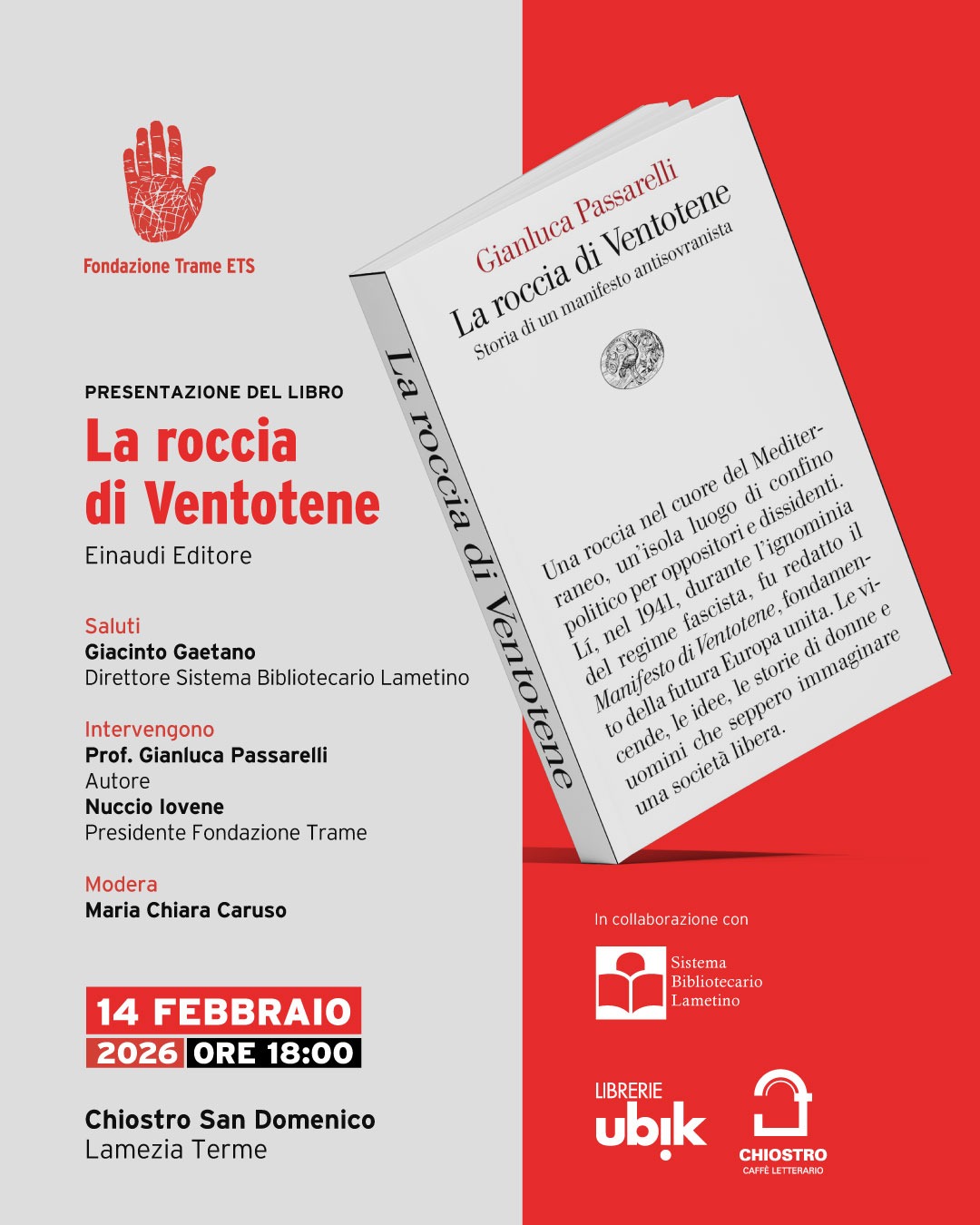 Il 14 febbraio 2026, alle ore 18 presso il Chiostro San Domenico di Lamezia Terme, la Fondazione Trame ETS e il Sistema Bibliotecario Lametino, presentano il libro “La roccia di Ventotene. Storia di un manifesto antisovranista” di Gianluca Passarelli, pubblicato da Einaudi Editore. Il volume prende le mosse dal Manifesto di Ventotene per interrogare l’Europa di oggi, la sua fragilità democratica e l’urgenza di un progetto politico capace di superare i nazionalismi.
