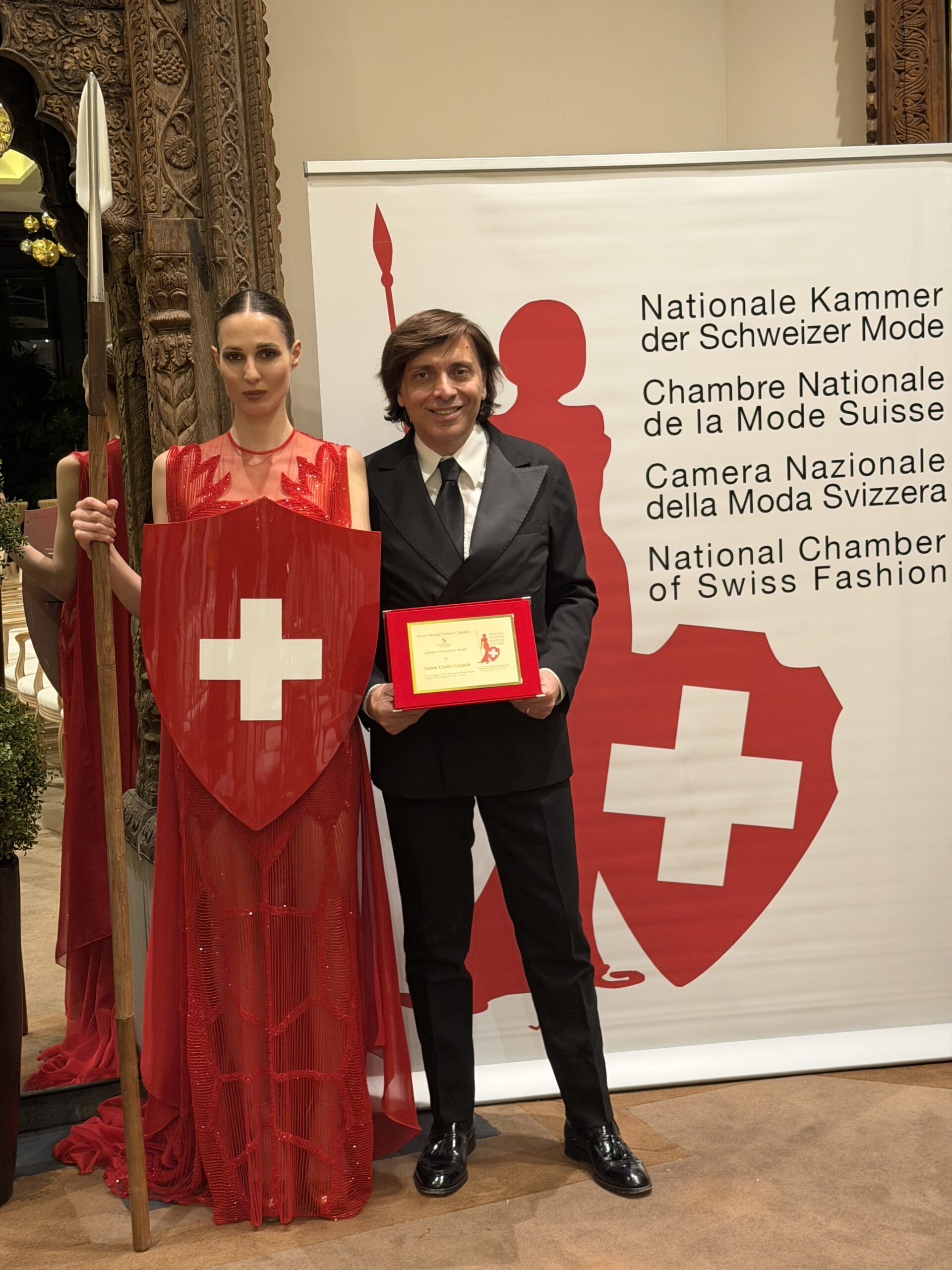 Ospite d’eccezione dell’evento è stato Anton Giulio Grande, stilista di fama mondiale, Presidente della Calabria Film Commission, Membro Esecutivo della CNMS e Special Guest dell’Associazione da oltre dodici anni, protagonista di una presentazione di altissimo livello creativo che ha suscitato unanime apprezzamento. Lo stilista ha ricevuto anche un premio alla carriera per la sua alta moda. Per l’occasione, Anton Giulio Grande ha firmato una reinterpretazione contemporanea dell’Abito Istituzionale di “Madre Helvetia”, figura simbolica della Camera Nazionale della Moda Svizzera e della Madre Patria, mantenendone intatta la forza identitaria e valoriale, arricchita da una visione moderna, solenne e di grande impatto scenico. Idea e paternità dell’immagine istituzionale di “Madre Helvetia”: Franco Taranto.