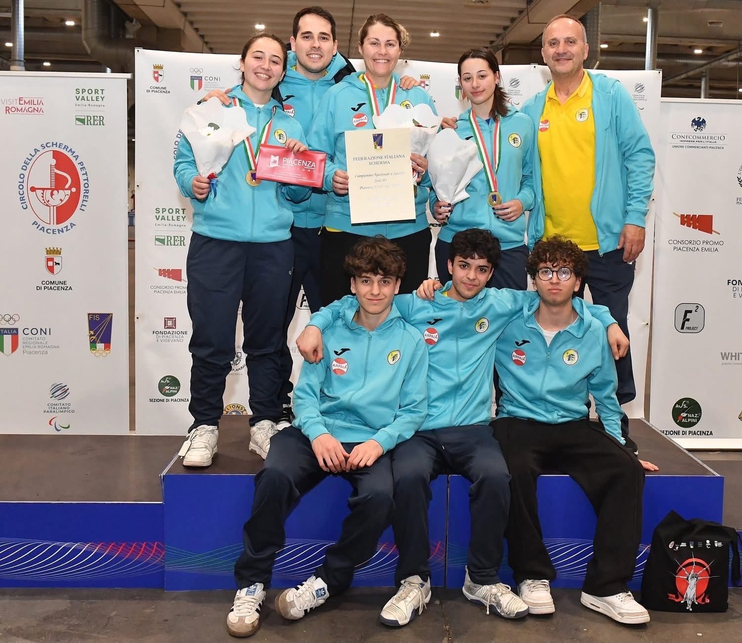 “Nell’ultima frazione– proseguono- la nostra squadra si trovava in svantaggio 39/40 ma la nostra Gloria Davoli con una prestazione straordinaria è riuscita a capovolgere l’esito della gara portando la squadra alla conquista del secondo titolo italiano in due anni. Si ricorda che l’anno scorso, sempre nella città di Piacenza, si è vinto il titolo di Campione d’Italia in serie B2. Con la promozione delle squadra femminile si raggiunge un traguardo storico in quanto entrambe le squadre il prossimo anno gareggeranno in serie A2. Il campionato di serie A2 rappresenta un traguardo cruciale per le squadre emergenti e soprattutto per i giovani talenti nel panorama della scherma italiana. La serie A2 rappresenta una vetrina importante e offre l’opportunità di confrontarsi con avversari e società migliori del nostro movimento.