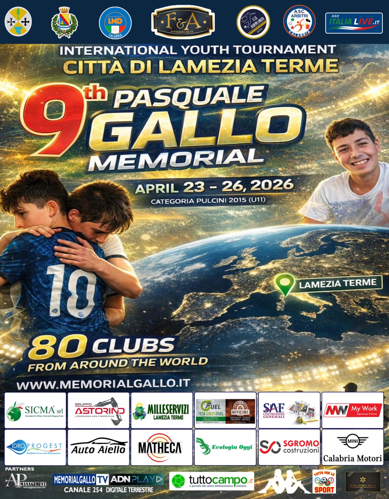 Tutto pronto per la nona edizione del Torneo Internazionale Città di Lamezia Terme – Memorial Pasquale Gallo. Dal 23 al 26 aprile la città ospiterà 80 squadre della categoria pulcini pronte a contendersi la vittoria finale e ad alzare al cielo il Trofeo vinto lo scorso anno dalla Fiorentina.