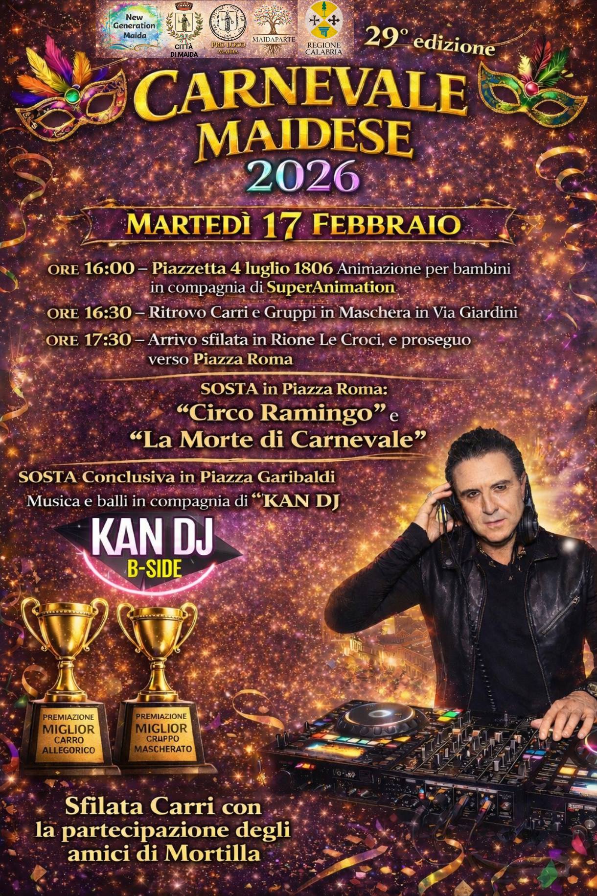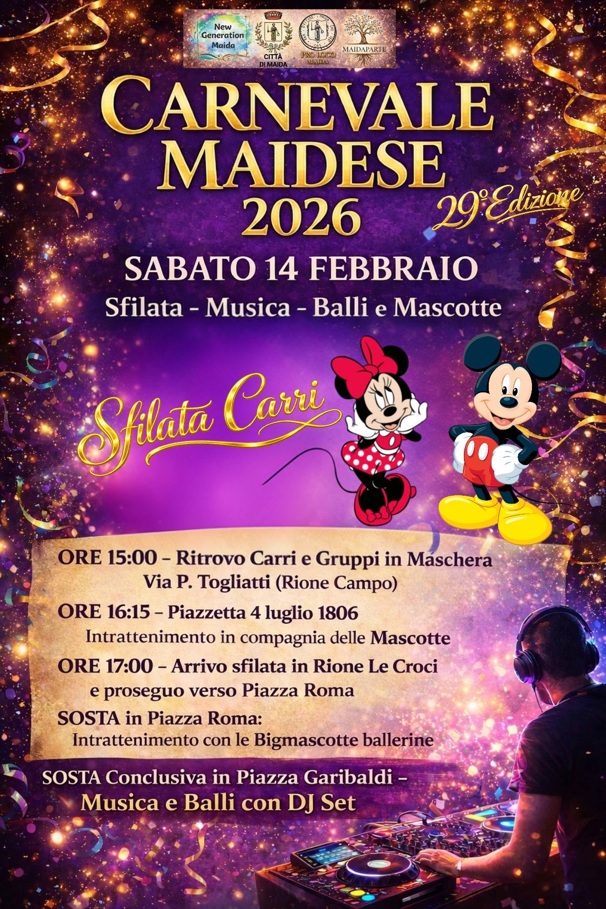 Il centro cittadino diventerà il cuore pulsante della festa grazie a un programma costruito insieme alla New Generation Maida, alle associazioni del territorio, ai giovani e a tanti cittadini. L’obiettivo è quello di offrire un Carnevale che parli a tutte le età, valorizzi le energie locali e trasformi le strade in uno spazio condiviso di musica, spettacolo e allegria.