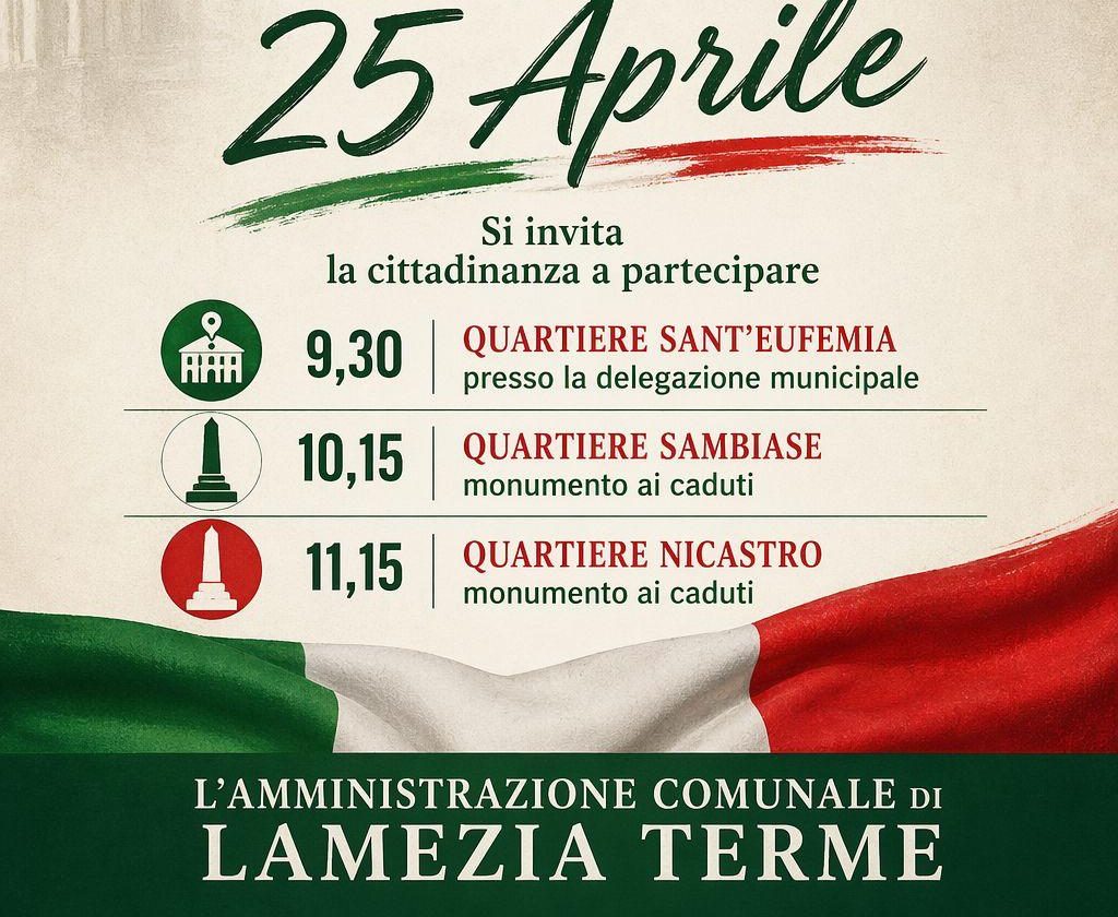 La città di Lamezia Terme si appresta a celebrare l’81° anniversario della Liberazione d’Italia con un programma che unisce il solenne omaggio ai caduti a momenti di riflessione collettiva, cultura e socialità.