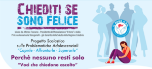 Storie di vita che arrivano dritte al cuore e che lasciano il segno. Istituzioni e testimoni hanno incontrato i ragazzi dell’istituto comprensivo “Perri-Pitagora-Don Milani” a Lamezia Terme nell’ambito del progetto “Chiediti se sono felice”, ideato da Alfonso Toscano, presidente dell’associazione “Il dono” e da Annamaria Stanganelli, già Garante regionale della Salute.