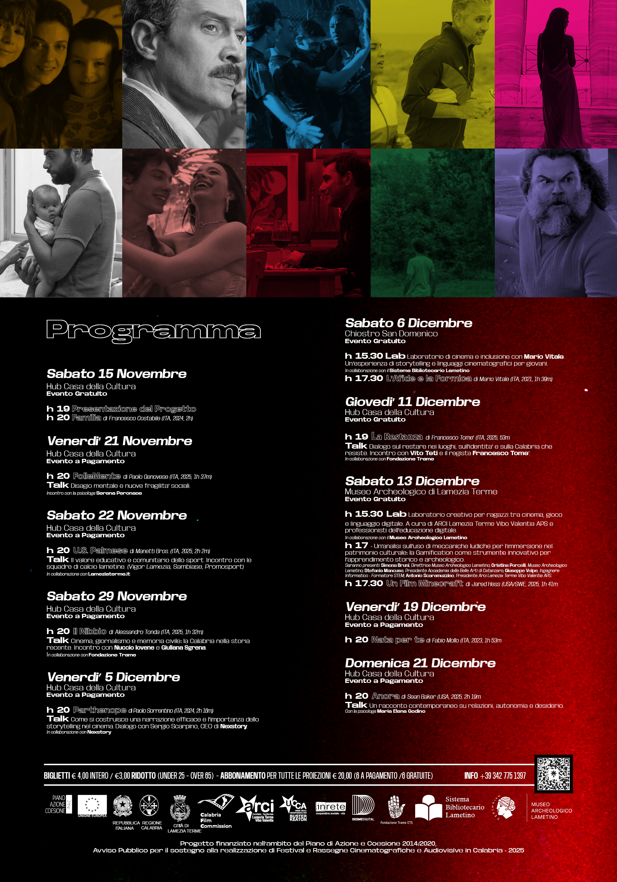 La rassegna, a cura di ARCI Lamezia Terme – Vibo Valentia APS, si svolge dal 15 novembre al 22 dicembre nei tre luoghi culturali della città – Hub Casa della Cultura, Museo Archeologico Lametino e Chiostro San Domenico – e rientra nell’Avviso Pubblico 2025 “Festival e Rassegne Cinematografiche e Audiovisive in Calabria”, promosso dalla Calabria Film Commission con il patrocinio del Comune di Lamezia Terme.