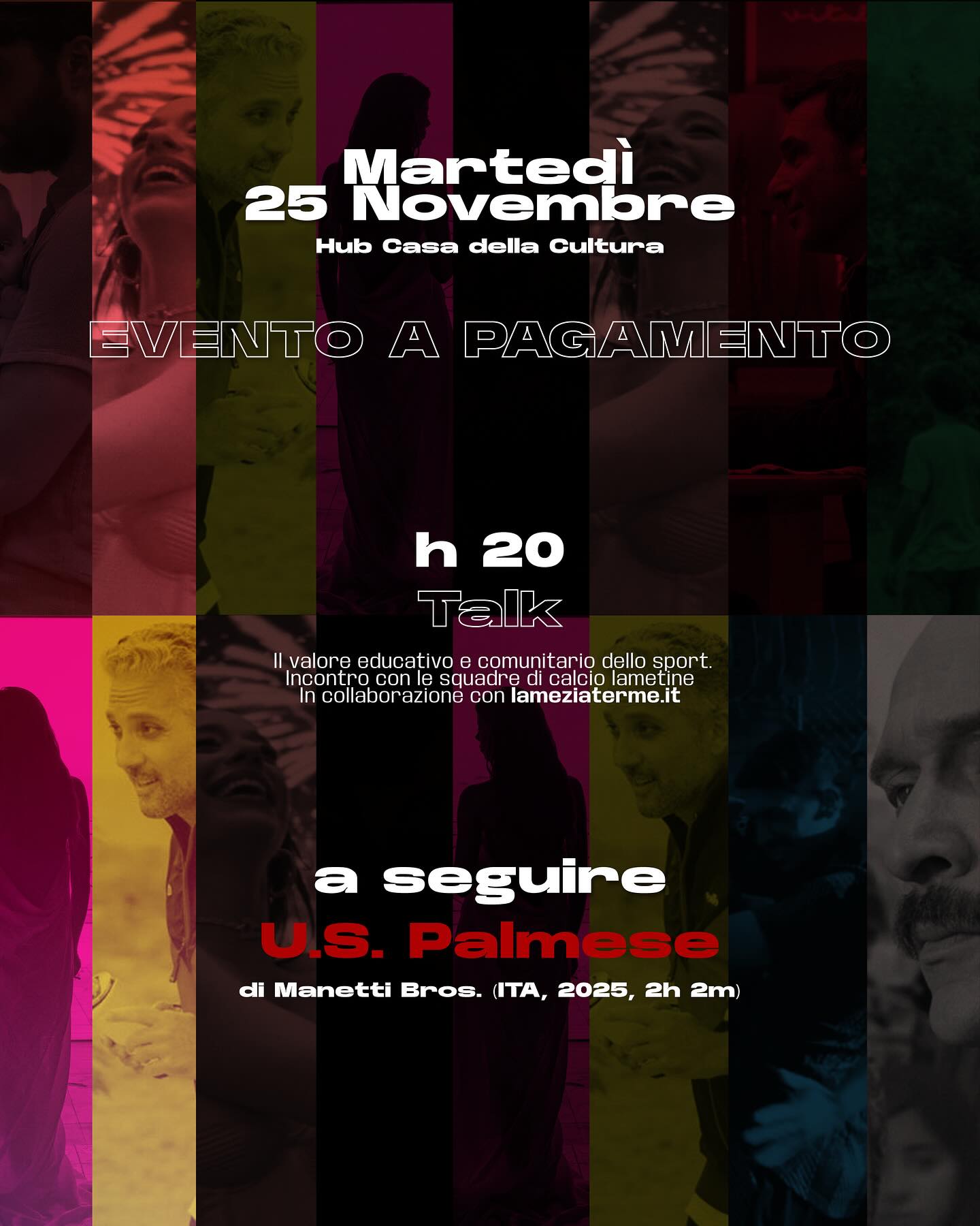 Martedì 25 novembre alle ore 20, sempre all’Hub Casa della Cultura, sarà poi la volta di U.S. Palmese, diretto dai Manetti Bros. (Italia, 2025, 2h 2m). Il film racconta il mondo del calcio dilettantistico come specchio di identità, appartenenza e riscatto, rivelando tutto il valore emozionale e comunitario dello sport. Il successivo talk, organizzato in collaborazione con Lameziaterme.it, vedrà la partecipazione delle squadre cittadine, chiamate a confrontarsi sul ruolo educativo dello sport nella crescita dei giovani e nella coesione del territorio.