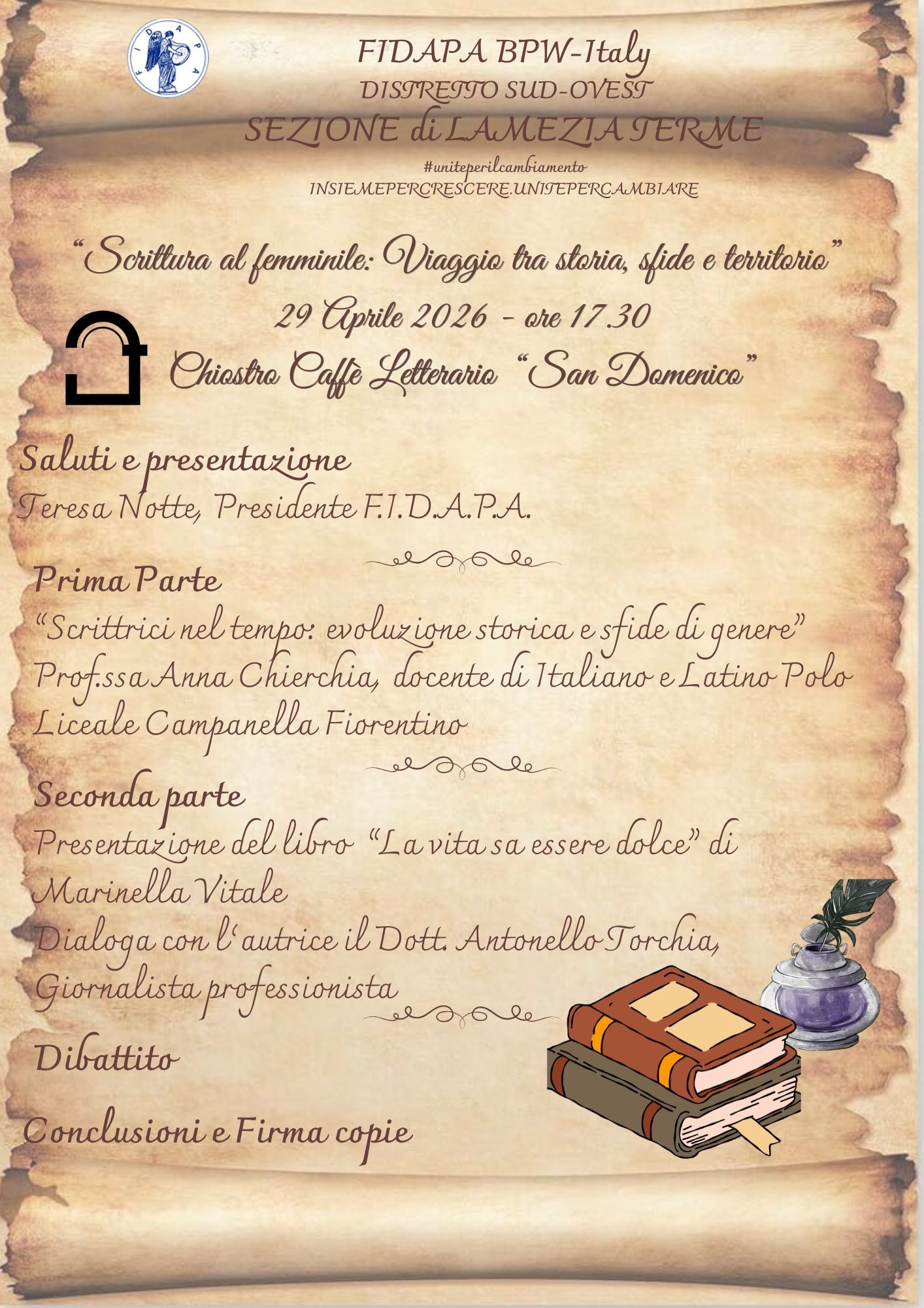 Si svolgerà mercoledì 29 aprile, alle ore 17:30, presso il Chiostro Caffè Letterario a Lamezia Terme, l’evento dal tema: “Scrittura al femminile: Viaggio tra storia, sfide e territorio”. L’incontro, organizzato dalla Fidapa – Sezione di Lamezia Terme, si aprirà con i saluti della presidente Fidapa di Lamezia Terme, Teresa Notte, che coordinerà i lavori.