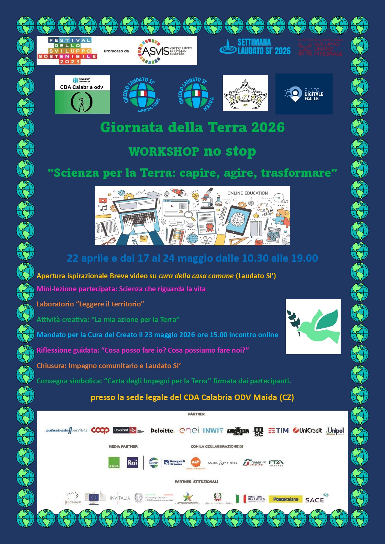 In occasione della Giornata della Terra, mercoledì 22 aprile – Maida, sede CDA Calabria ODV, si terrà il workshop “Scienza per la Terra: capire, agire, trasformare”, animato dal Punto di Facilitazione Digitale del CDA Calabria ODV, in collaborazione con i Circoli Laudato Si’ di Maida e Lamezia Terme e l’associazione ESTER APS. Introduce e modera Graziella Catozza, Presidente CDA Calabria ODV