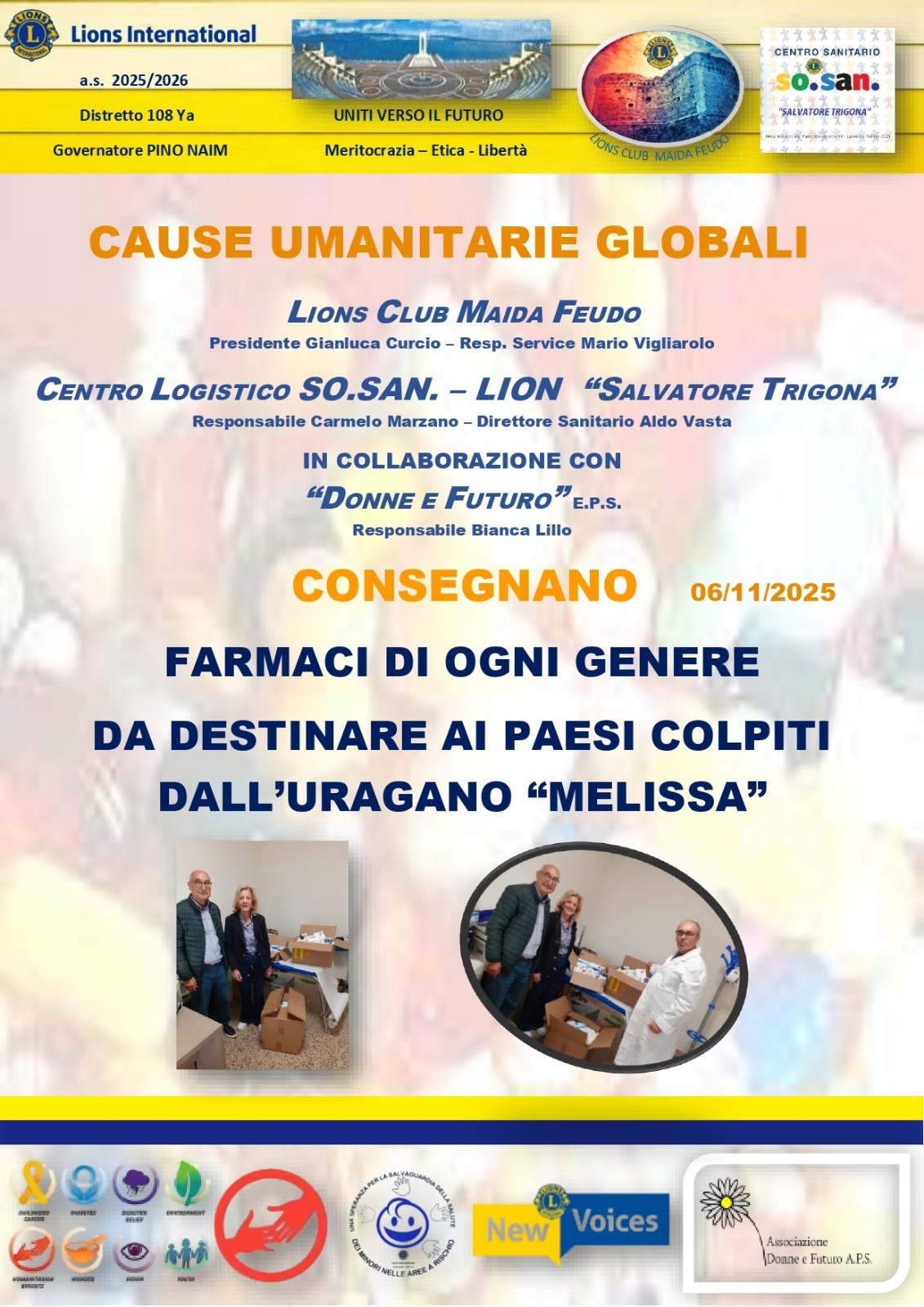 Il Club Lions Maida Feudo presieduto da Gianluca Curcio, il Centro So.San “Salvatore Trigona” di cui è responsabile Carmelo Marzano, in fattiva collaborazione con l’associazione Donne e Futuro EPS, hanno donato una cospicua quantità di farmaci di ogni tipo per le popolazioni caraibiche colpite dall’uragano Melissa. Come è noto, l’evento calamitoso ha determinato grande devastazione in diversi paesi dei Caraibi tra cui Cuba, le Bahamas, Haiti e la Giamaica. Melissa, con venti fino a 195 km/h, forti piogge e mareggiate violente, ha spazzato via tutto ciò che ha trovato sulla sua traiettoria.