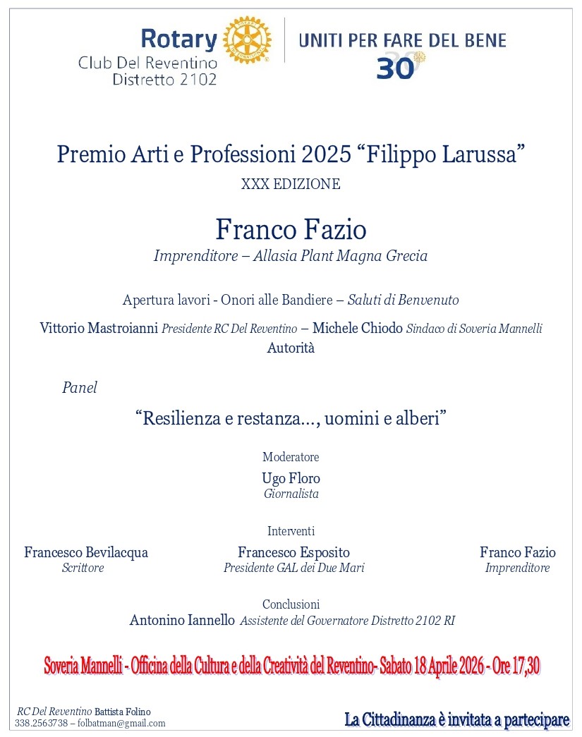 Il Rotary Club del Reventino annuncia la trentesima edizione del Premio Arti e Professioni “Filippo Larussa”, in programma per sabato 18 aprile 2026 alle ore 17:30 presso l’Officina della Cultura e della Creatività del Reventino, a Soveria Mannelli. Un’occasione per valorizzare storie di eccellenza e per rafforzare il dialogo tra impresa e comunità.