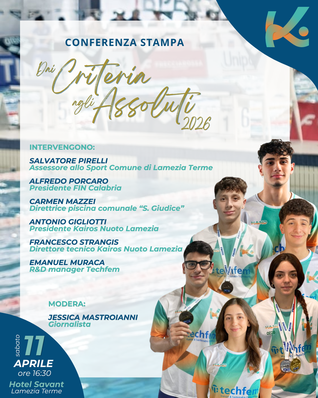 Sull’onda dei risultati straordinari conquistati ai Criteria 2026 di Riccione, la Kairos Nuoto Lamezia annuncia la conferenza stampa in programma per domani, sabato 11 aprile, alle ore 16:30, presso l’Hotel Savant di Lamezia Terme.