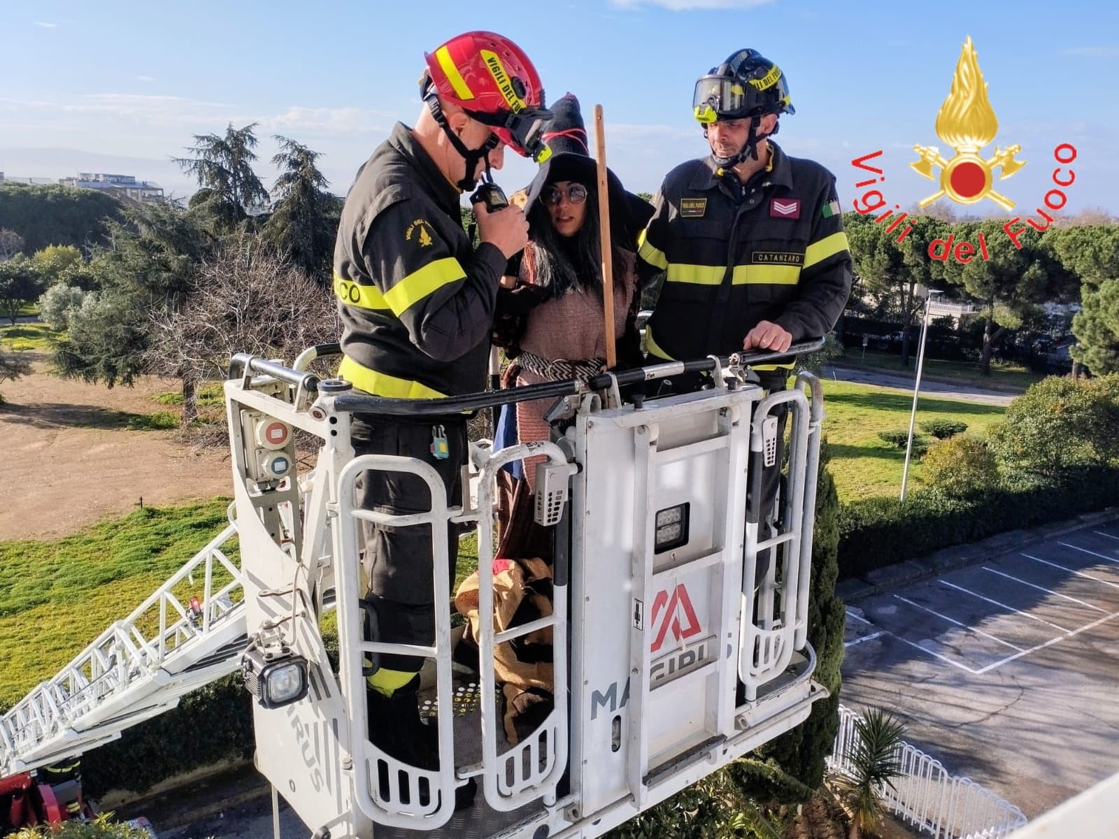 La Befana speciale dei Vigili del Fuoco del Comando di Catanzaro, distaccamento di Lamezia Terme, è giunta in modo spettacolare a bordo dell’autoscala, raggiungendo il piano dell’ospedale e facendo il suo ingresso dalla finestra del reparto di Pediatria, tra lo stupore e l’entusiasmo dei bambini, dei loro genitori e del personale sanitario.
