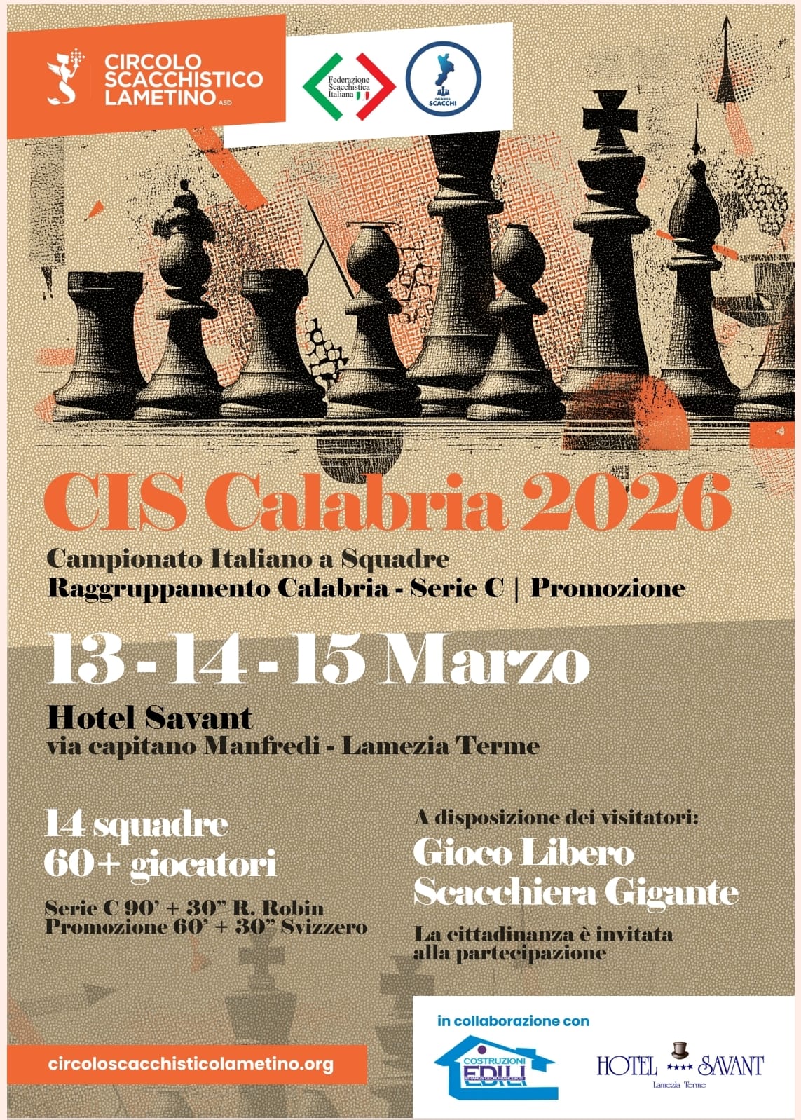 Lamezia Terme si prepara ad accogliere un importante appuntamento del panorama scacchistico calabrese: i Tornei Nazionali di Scacchi a Squadre di “Promozione” e “Serie C” – Divisione Calabria, in programma presso il ‘Savant Hotel’. L’evento è ufficialmente inserito nel calendario della Federazione Scacchistica Italiana e si svolge con il patrocinio del Comitato Regionale Scacchistico Calabrese.