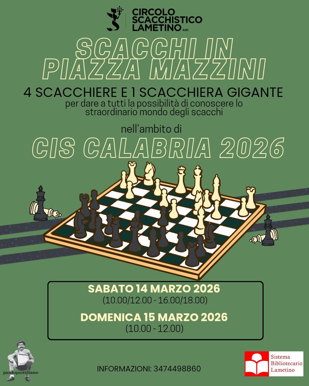 “Accanto alle gare ufficiali- spiega a City one Lorenzo Curcio componente del CSL– l’iniziativa prevede una serie di eventi collaterali aperti alla cittadinanza, che si terranno presso la vicina Piazza Mazzini. Saranno allestiti tavoli con scacchiere a disposizione di adulti e bambini e sarà installata una scacchiera gigante con pezzi alti 60 centimetri, resa disponibile grazie alla collaborazione con il Sistema Bibliotecario Lametino. Il pubblico potrà inoltre assistere alle partite attraverso visite contingentate nelle sale di gioco, organizzate in gruppi di dieci persone per volta, nel rispetto della concentrazione degli atleti.”