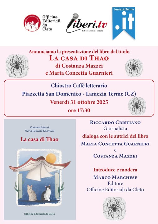 Un appuntamento dedicato ai lettori e agli amanti della buona letteratura è in programma a Lamezia Terme: venerdì 31 ottobre 2025, alle ore 17:30, presso il Chiostro Caffè Letterario di Piazzetta San Domenico, si terrà la presentazione del libro “La casa di Thao”, scritto da Costanza Mazzei e Maria Concetta Guarnieri.