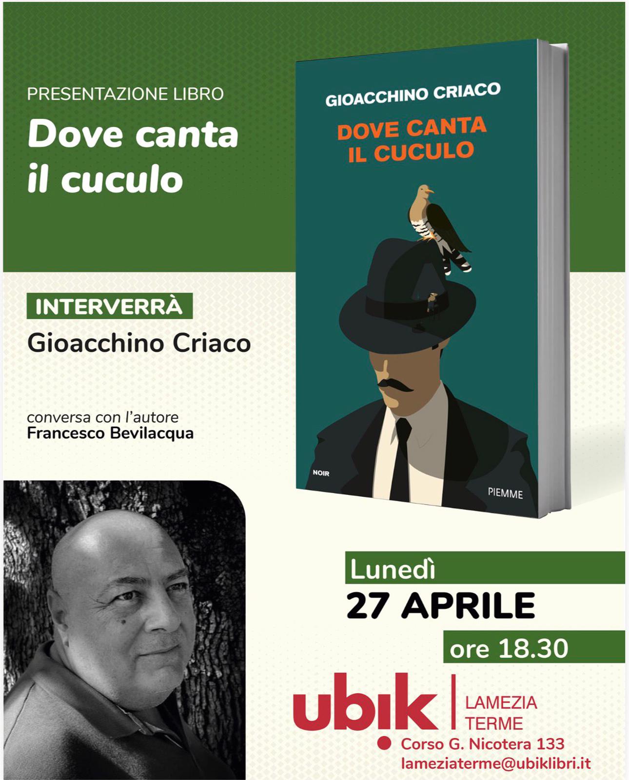 Un appuntamento imperdibile lunedì 27 aprile alle ore 18.30 si terrà a Lamezia Terme la presentazione del nuovo attesissimo romanzo di Gioacchino Criaco, “Dove canta il cuculo”, pubblicato da Piemme.