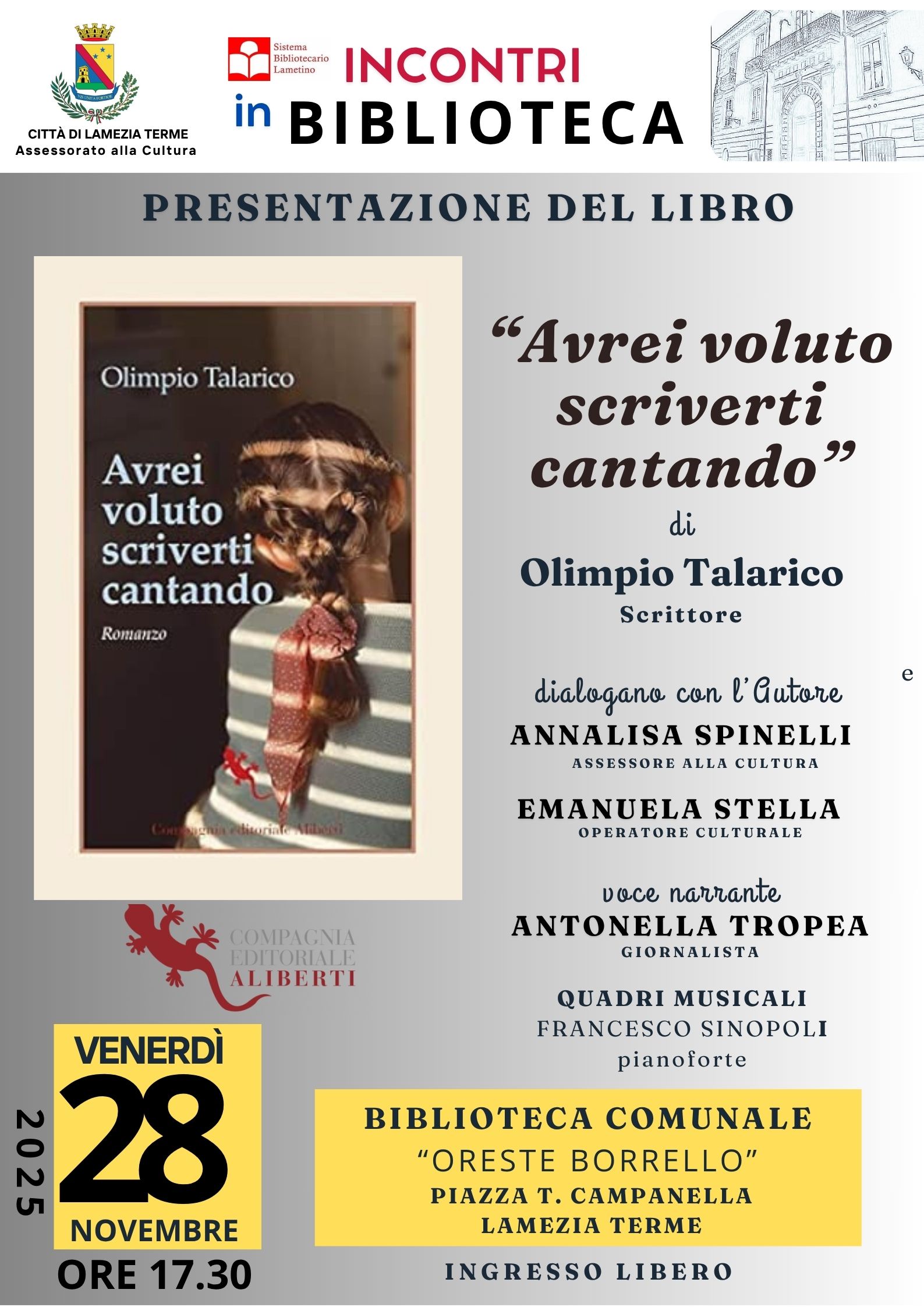 Venerdì 28 novembre 2025, alle ore 17.30, la Biblioteca Comunale “Oreste Borrello” (Piazza T. Campanella) ospiterà la presentazione del romanzo “Avrei voluto scriverti cantando” (Compagnia Editoriale Aliberti), ultima opera dello scrittore calabrese Olimpio Talarico.