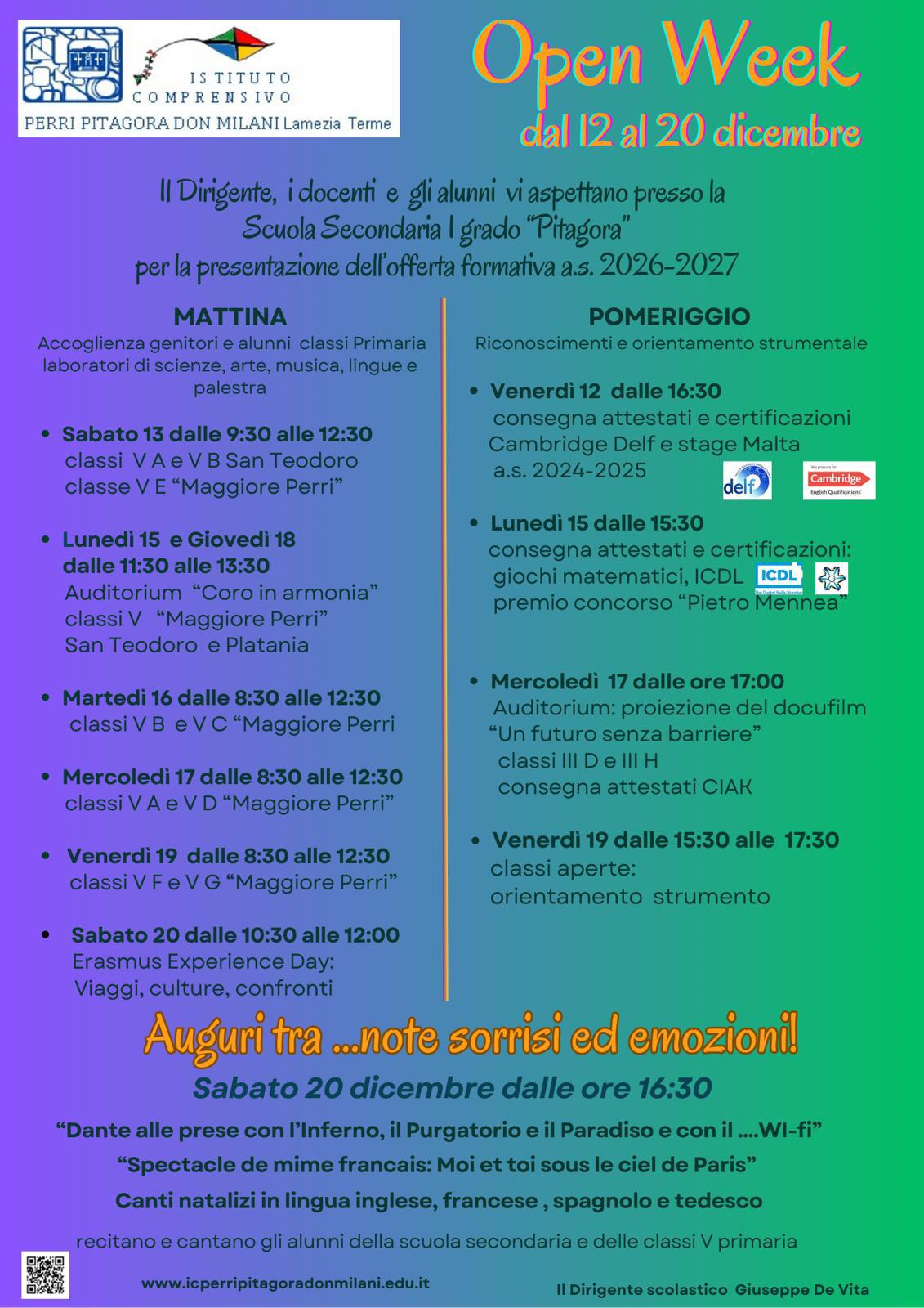 Nel pomeriggio, invece, come dettagliato nella nostra locandina, sono previste tante attività, laboratori e momenti di approfondimento pensati per far vivere in modo ancora più diretto l’esperienza scolastica. La Settimana di Open Week si concluderà il 20 dicembre con il primo Open Day, momento conclusivo di incontro e condivisione con le famiglie.