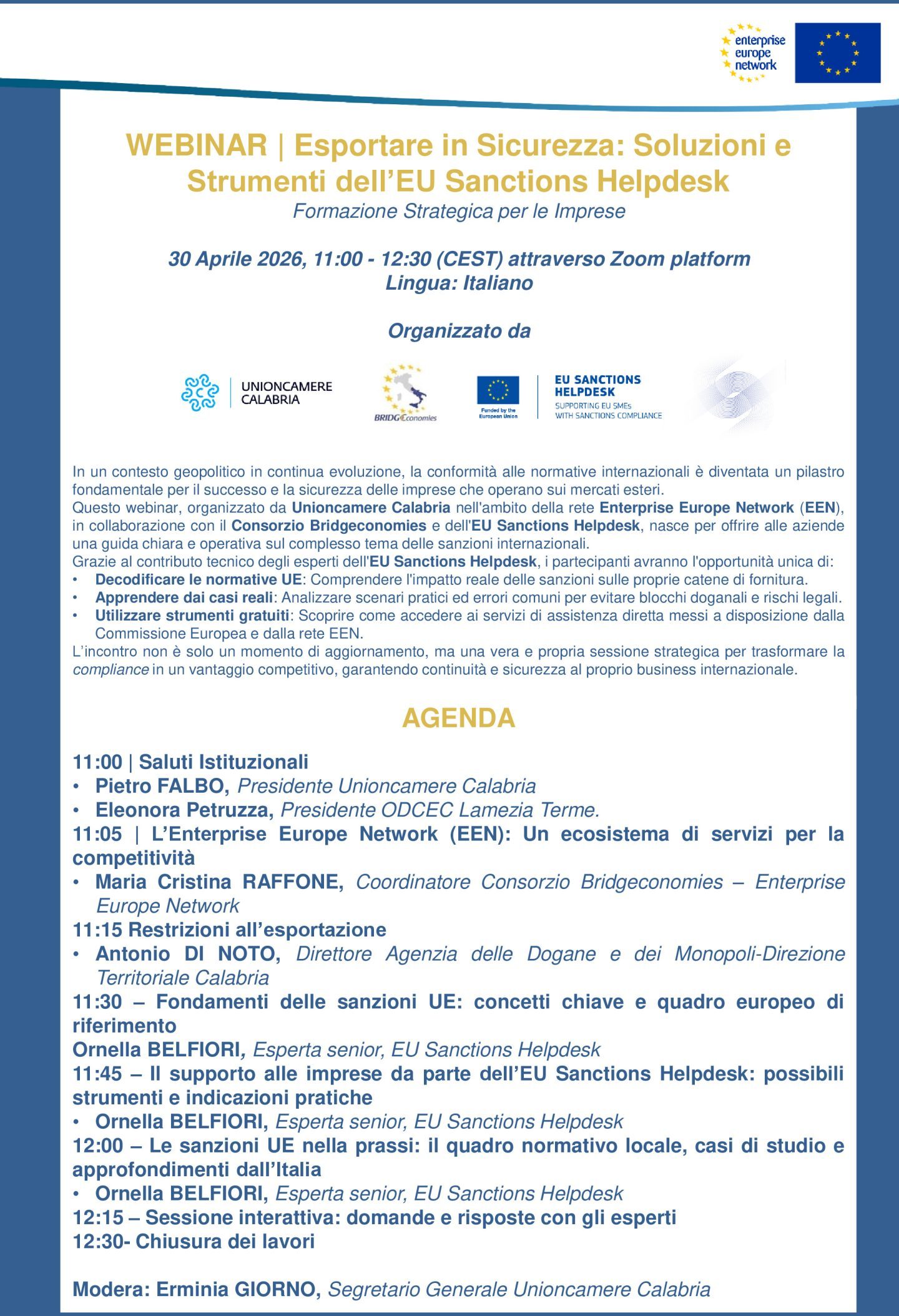 Si terrà il 30 aprile 2026 dalle ore 11:00 alle ore 12:30 il webinar dal titolo “Esportare in sicurezza: soluzioni e strumenti dell’EU Sanctions Helpdesk” organizzato da Unioncamere Calabria, in qualità di sportello della rete Enterprise Europe Network (EEN), in collaborazione con il Consorzio Bridgeconomies e con l’EU Sanctions Helpdesk per offrire alle aziende una guida chiara e operativa sul complesso tema delle sanzioni internazionali.