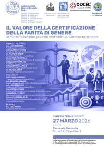 Si terrà venerdì 27 marzo 2026 alle ore 16:30, nel salone del Seminario Vescovile di Lamezia Terme in Piazza F.A. D’Ippolito n. 8, il convegno dal titolo “Il valore della certificazione della parità di genere – Strumenti giuridici, esoneri contributivi, vantaggi di mercato”, organizzato dall’Associazione Donne Giuriste Italia – Sezione di Lamezia Terme.