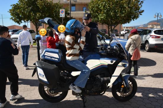 Il percorso è proseguito nel piazzale esterno, dove i bambini hanno potuto osservare da vicino i mezzi in dotazione alla Polizia di Stato. Gli alunni sono saliti a bordo di una “Volante” e di una moto di servizio, vivendo un’esperienza coinvolgente e formativa. Particolare entusiasmo ha suscitato la possibilità di indossare il casco e di conoscere le caratteristiche operative dei veicoli utilizzati quotidianamente per il controllo del territorio.