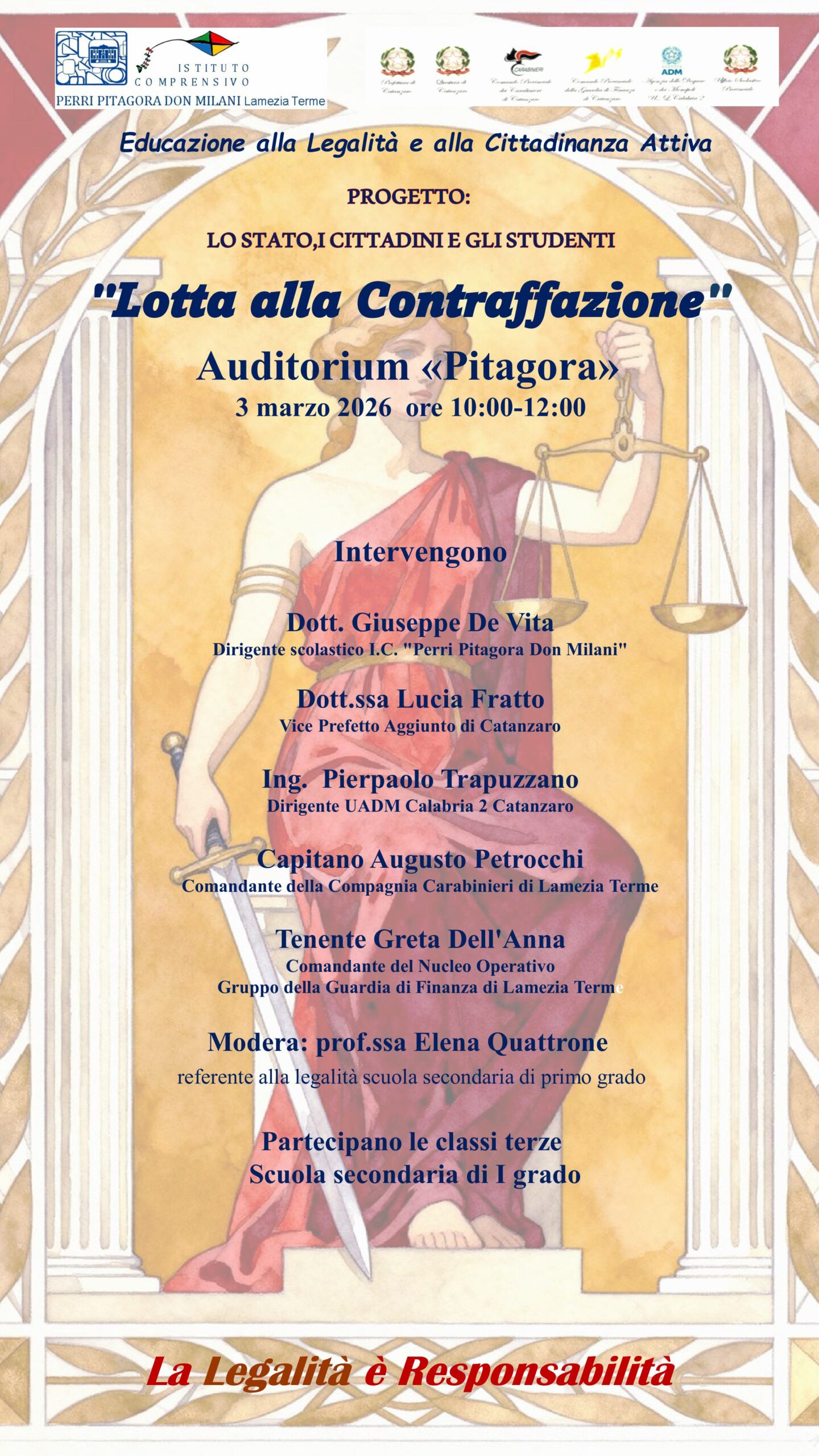 L’auditorium della scuola secondaria Pitagora, il 3 marzo prossimo ospiterà un importante evento riguardante il progetto suddetto che nasce dalla collaborazione tra la Prefettura di Catanzaro, l’Ufficio Locale Calabria 2 Catanzaro dell’Agenzia delle Dogane e dei Monopoli, l’Ufficio Scolastico Regionale per la Calabria – Ambito territoriale di Catanzaro, la Questura di Catanzaro, il Comando Provinciale dei Carabinieri e il Comando Provinciale della Guardia di Finanza.