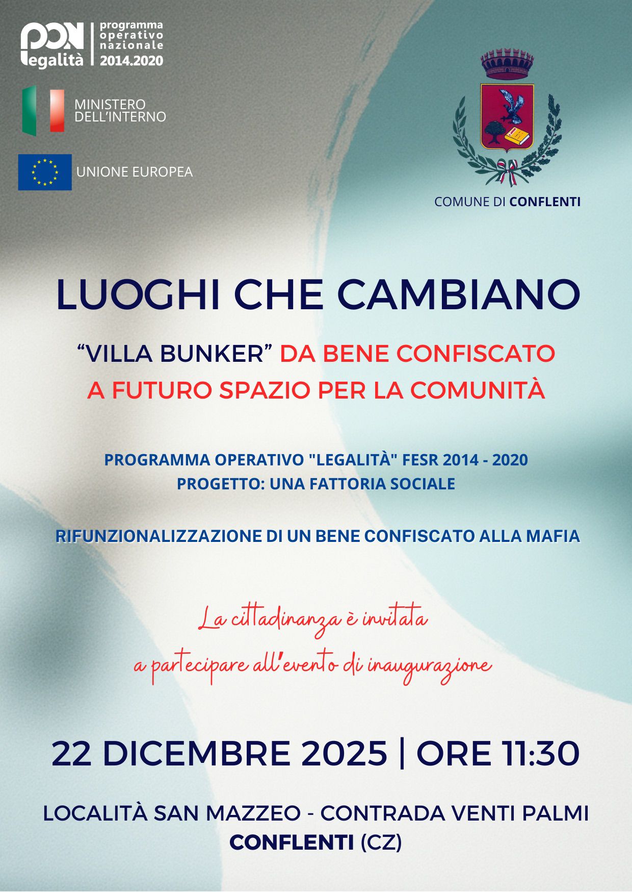 La consegna ufficiale del bene – per la parte strutturale – avverrà nel corso di un evento pubblico in programma lunedì 22 dicembre, alle 11.30, in località San Mazzeo Contrada Venti Palmi, alla presenza del Sottosegretario di Stato al Ministero dell’Interno, Wanda Ferro, del Prefetto di Catanzaro Castrese De Rosa, del Presidente della Provincia Mario Amedeo Mormile, del Sindaco di Conflenti Francesco Emilio D’Assisi e del Presidente della Commissione regionale contro la ’ndrangheta Marco Polimeni. Prevista anche la benedizione della struttura a cura di don Giovanni Marotta, parroco di Conflenti.