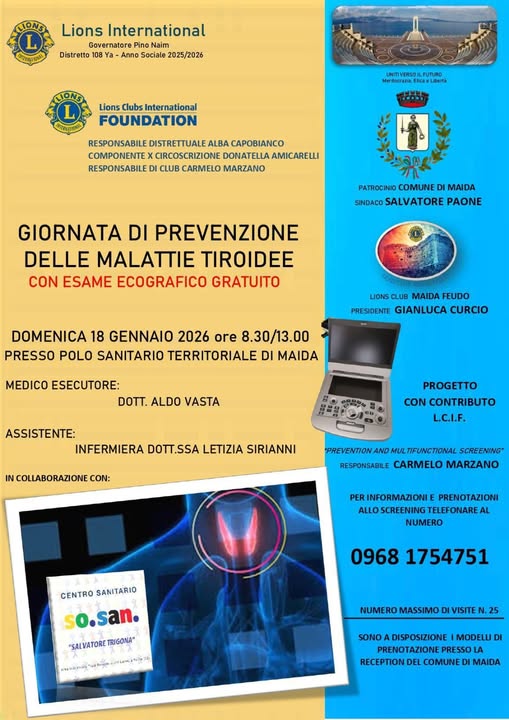 Si è tenuta domenica 18 gennaio a Maida un’importante giornata di screening gratuito dedicato alla tiroide, organizzata dal Comune di Maida, presso il Polo Sanitario Territoriale di Maida, in collaborazione con il Lions Club Maida Feudo e il centro sanitario So.san Salvatore Trigona.