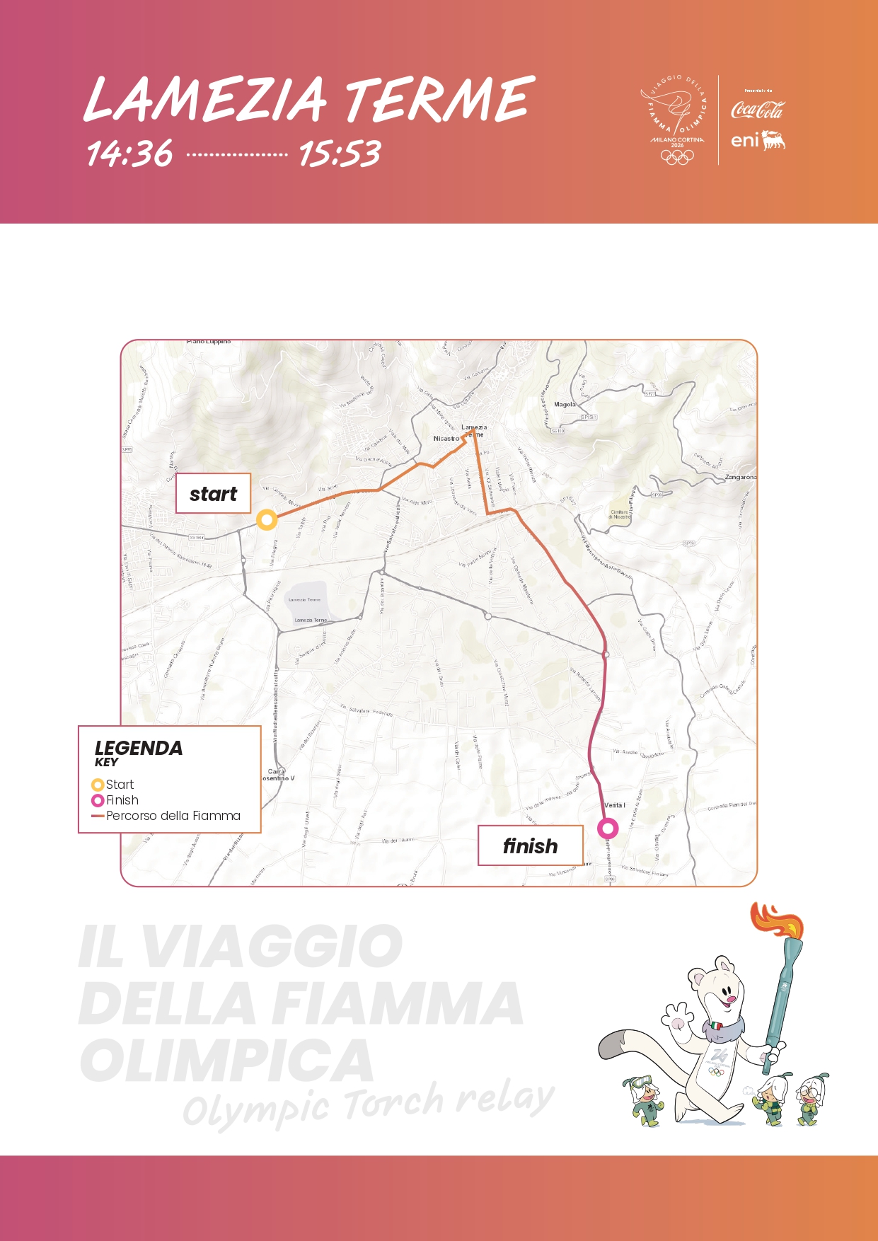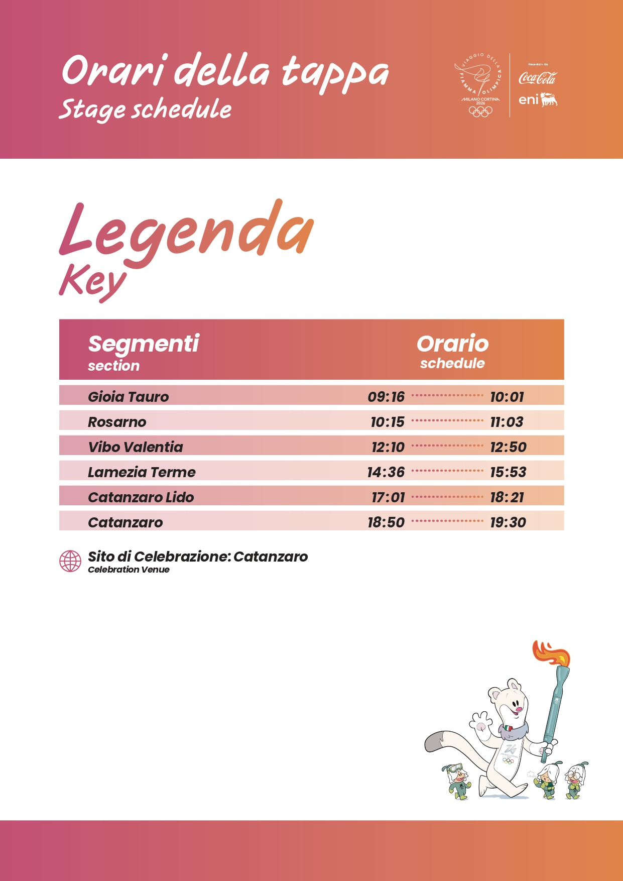 I tedofori della giornata saranno il pilota Antonio Fuoco, Anna Russo, Simone Alessio, bronzo olimpico di taekwondo, Massimo Palanca e Francesca Stancati. Anche in questa tappa saranno presenti villaggi esperienziali per valorizzare il territorio e le eccellenze locali.
