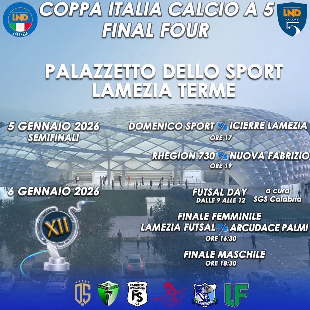 Lamezia Terme si prepara a vivere una giornata storica per lo sport cittadino. Lunedì 5 gennaio 2026 prenderanno ufficialmente il via le attività del Nuovo Palazzetto dello Sport di Lamezia Terme, che inaugura il proprio percorso con la Final Four regionale di Coppa Italia Calcio a 5. In vista dell’evento inaugurale, l’assessore allo Sport del Comune di Lamezia Terme, Salvatore Pirelli, invita la stampa e la cittadinanza a prendere parte a un appuntamento simbolo di una nuova stagione per lo sport lametino.