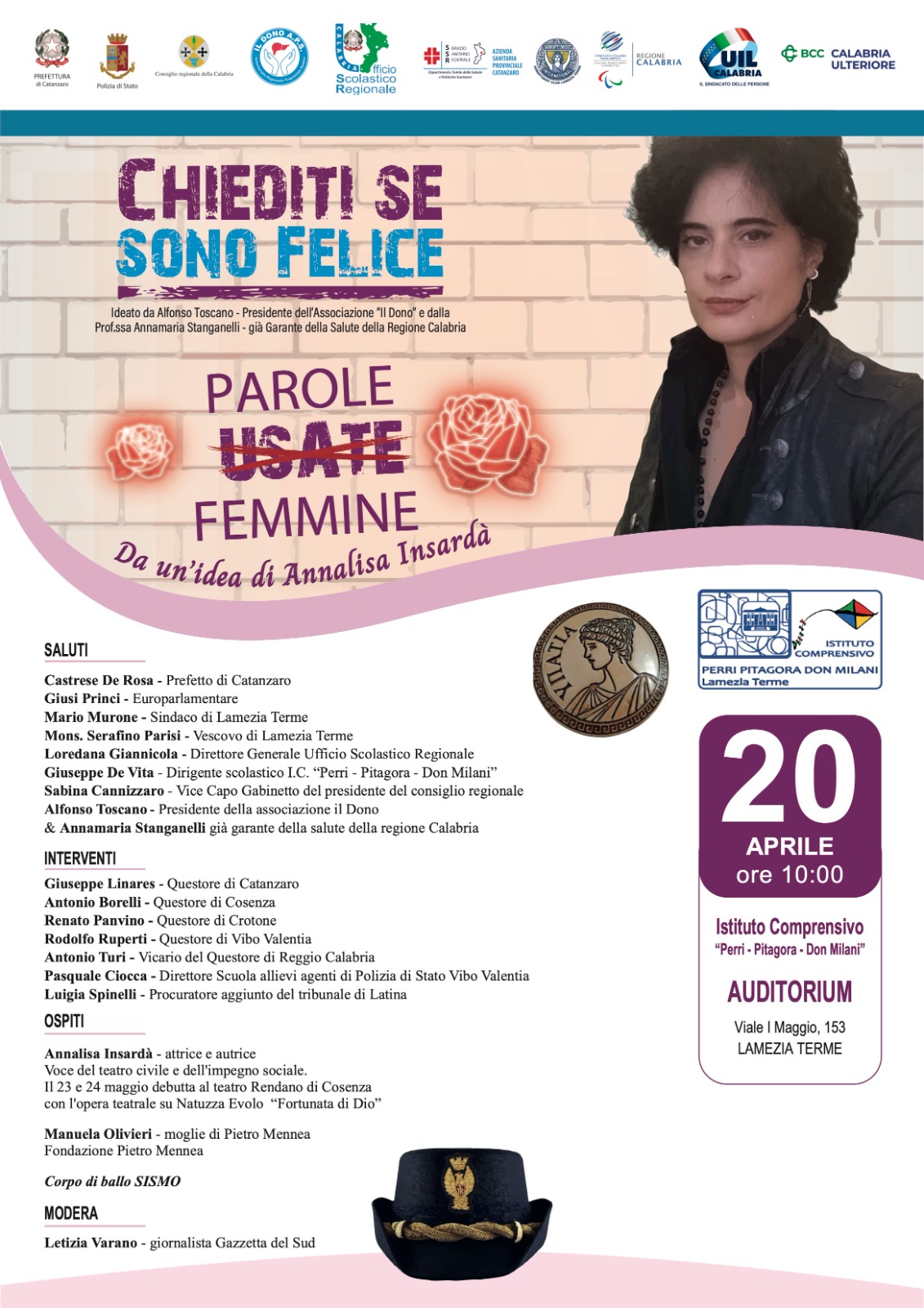 Lunedì 20 aprile, a partire dalle ore 10:00, la città di Lamezia Terme diventerà il palcoscenico di un dibattito profondo con l’evento intitolato “Parole femmine” inserito nell’ambito del progetto “Chiediti se sono felice”, ospitato nell’Auditorium dell’Istituto Comprensivo “Perri – Pitagora – Don Milani”. Il progetto, nato dalla sinergia ideale tra l’attrice e autrice Annalisa Insardà, il presidente dell’associazione “Il Dono” Alfonso Toscano e la prof.ssa Annamaria Stanganelli, già Garante della Salute della Regione Calabria, punta a scuotere le coscienze attraverso il potere del linguaggio e dell’impegno civile. Per questo, nel corso dell’evento verranno premiate delle donne appartenenti alle Forze dell’ordine e alla Prefetture e celebrate le donne straordinarie che hanno partecipato al progetto scolastico “Chiediti se sono felice” e che hanno trasformato lutti, drammi e lacrime in forza, realizzando progetti di notevole importanza.