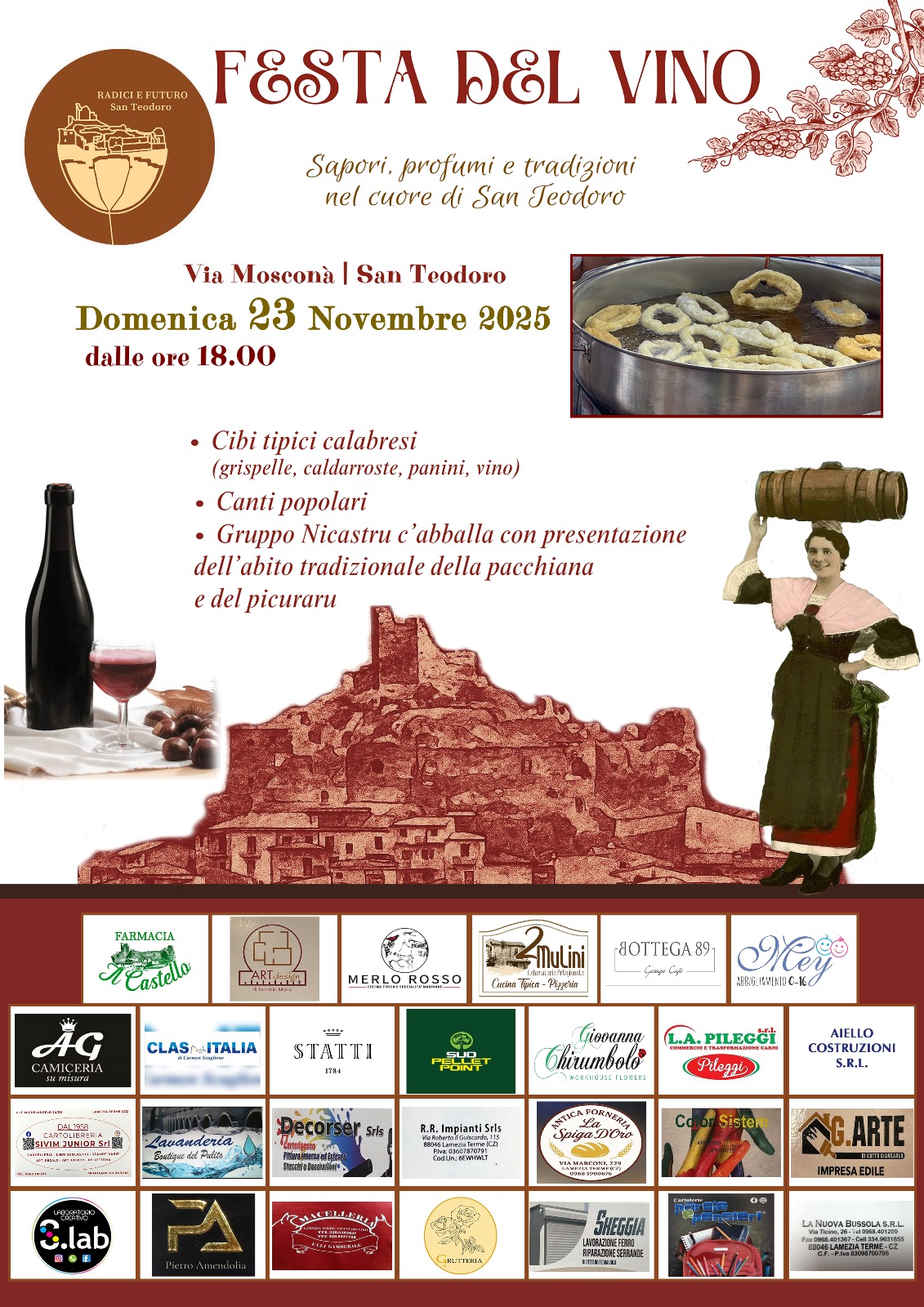 Durante la serata, sarà possibile degustare specialità calabresi – tra cui grispelle, caldarroste, panini e naturalmente vino locale – accompagnate da musica dal vivo, canti e danze tradizionali. Non mancheranno momenti dedicati alla storia e alla cultura del territorio, con la performance del gruppo “Nicastru c’abballa”, che proporrà i costumi storici della pacchiana e del picuraru, simboli dell’identità contadina lametina.