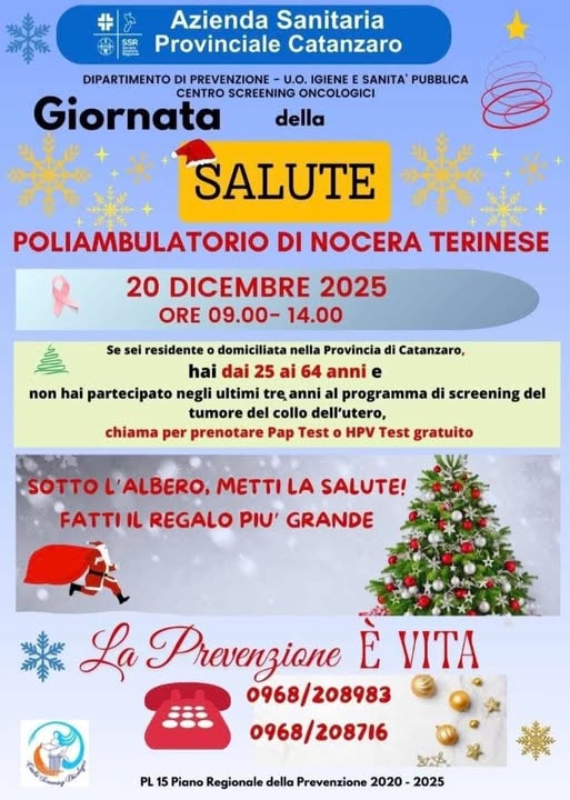 Sabato 20 dicembre 2025, il Poliambulatorio di Nocera Terinese aprirà le sue porte per una mattinata interamente dedicata alla salute femminile. Dalle 09:00 alle 14:00, sarà possibile partecipare alla “Giornata della Salute”, un’iniziativa pensata per rendere lo screening oncologico un gesto semplice, accessibile e gratuito.