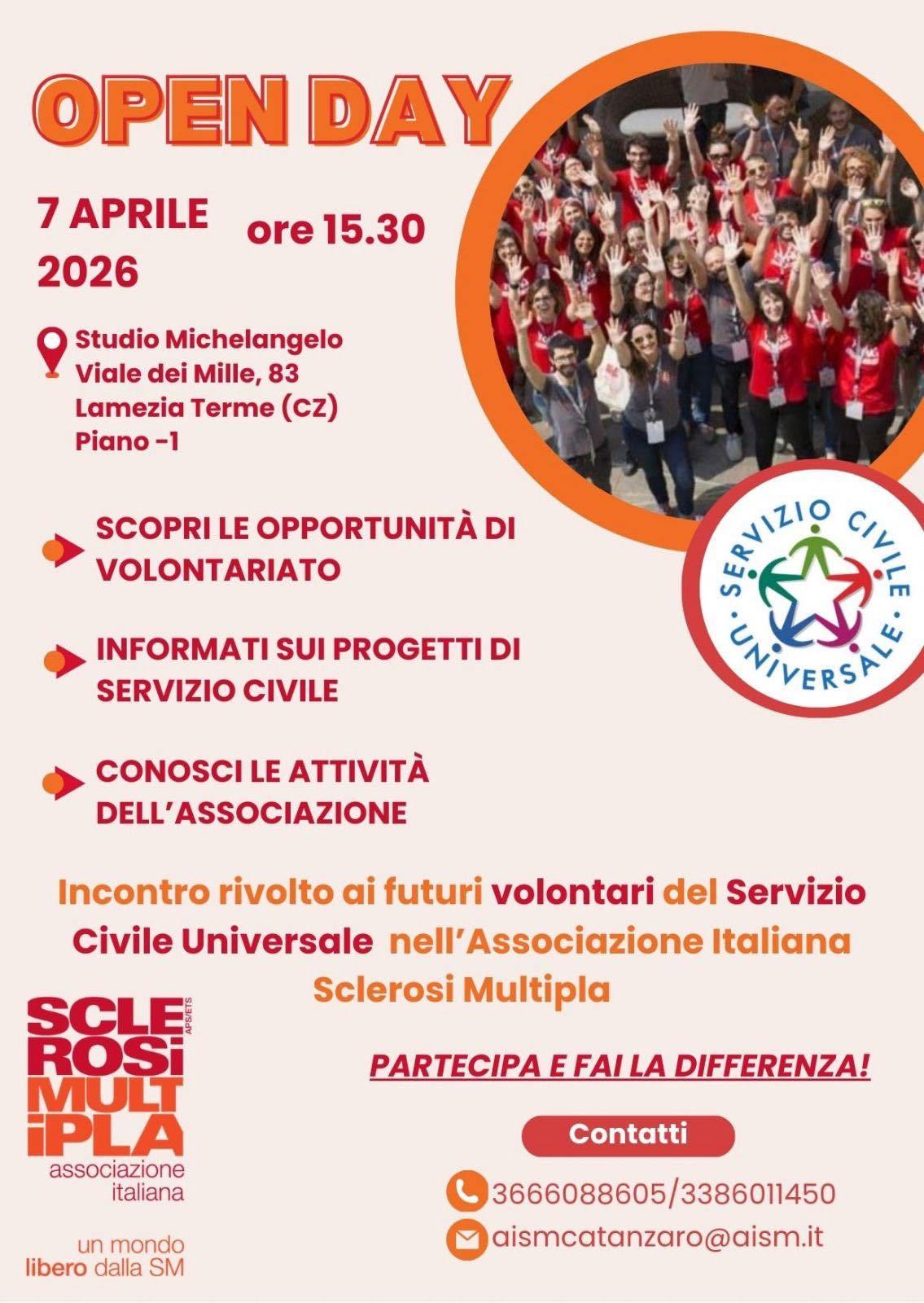Per offrire informazioni dettagliate e rispondere a dubbi e curiosità, la sezione AISM organizza un open day rivolto a tutti i giovani interessati. L’incontro sarà un’occasione per conoscere da vicino l’associazione, approfondire i contenuti dei progetti e orientarsi nella scelta del percorso di servizio civile più adatto.