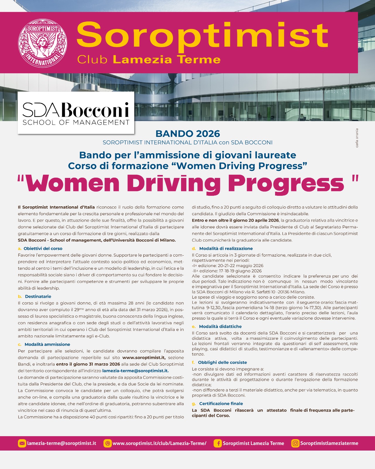 Un corso di formazione gratuito sulla leadership femminile e l’empowerment professionale rivolto a giovani donne (età massima 28 anni), in possesso di laurea specialistica o magistrale e buona conoscenza della lingua inglese, residenti o domiciliate nel Comune di Lamezia Terme. È quanto prevede il prestigioso bando promosso dal Soroptimist International d’Italia insieme a SDA Bocconi dal titolo “Women Driving Progress”, un percorso di alta formazione d’eccellenza realizzato in collaborazione con la SDA Bocconi School of Management di Milano.