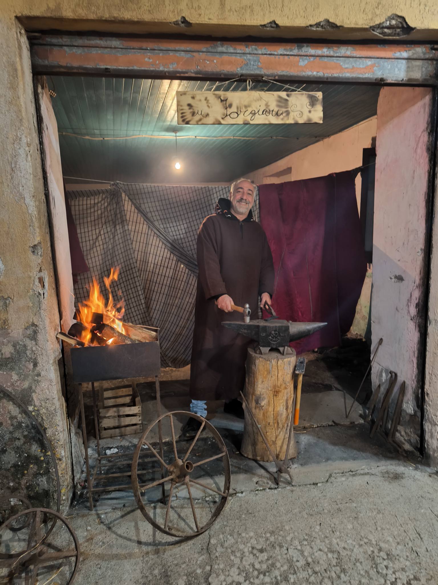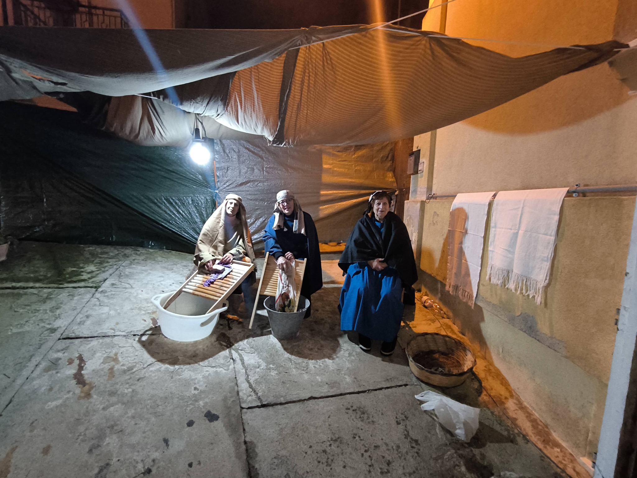 Il percorso scenografico ha accompagnato il pubblico in un viaggio suggestivo tra antichi mestieri e scene di vita quotidiana: dal vasaio alla cantina, dal telaio alle lavandaie, dalla preparazione delle zeppole alla locanda e all’osteria, dove la voce narrante ha rievocato il celebre “non c’è posto” per Giuseppe e Maria. Presenti anche il mercato, le ricamatrici, il fornaio, la famiglia intenta a preparare la pasta fatta in casa, la lavorazione del sapone artigianale, il calzolaio e il fabbro. Particolarmente apprezzata la presenza degli animali – tra cui l’asinello e il vitellino – resa possibile grazie alla disponibilità delle aziende agricole locali, che hanno contribuito a rendere l’atmosfera ancora più realistica.